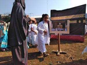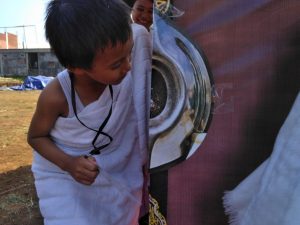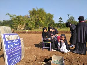 Terompah kaki Jamaah membuat kepulan debu di musim kemarau seakan menjadi saksi perjalanan suci menuju Baitullah. Hal terpenting dalam haji berkumpul di Arafah, tidak syah haji sesorang jika tidak ke arofah. Jamaah berjalan menuju lapangan SD sebagai miniatur Arofah, terpasang banner besar gambaran arofah. Menunggu kloter-kloter lain berkumpul, santri menikmati air dan buah semangka segar yang sudah disiapkan ustdadzah Roihah. “Hmmm….segar komentar santri kloter jawa tengah” sambil menikmati potongan buah semangka ditangannya.