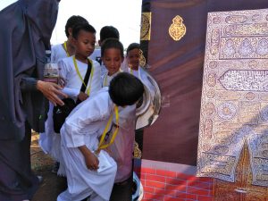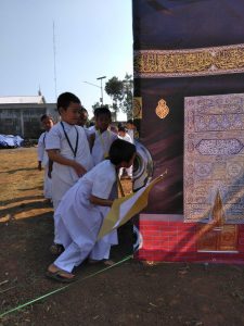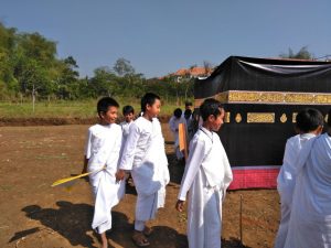 Panas Matahari dipagi hari, menghangat tubuh para jamaah, tetap khusuk merekapun melanjani dengan riang. Tak terdengar keluh-kesah dari santri, wajah memancarkan rona senang dan bangga, telah berlatih haji. Mereka melakukan prosesi manasik dengan tertib, sesekali mereka mencium miniatur hajar aswad yang melekat di dekat ka’bah, membaca:
