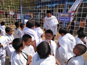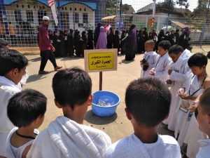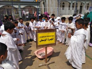 Suara tidak asing lagi terdengar, ya…Ustad Arif Kepala Sekolah SDI Al Umm, membuka khutbah Arofah, memecah hiruk-pikuk para jamaah. Saat khutbah berlangsung, posisi jamaah bermacam-macam, ada yang selonjor, ada duduk, jongkok, sikap merekapun juga beragam ada yang mendengarkan, berbisik dengan teman sebelah, adapula yang sibuk memperbaiki baju ihrom yang sudah berubah bentuk bahkan sebagian santri menjadikan baju ihrom sebagai” payung” untuk menghadang terik matahari. Tingkah polah santri kadang membuat para Ustad dan Ustadzahnya gemas, geram dan tersenyum, itulah anak-anak dengan kepolosannya, keluguannya memberi warna dalam hidup ini. Selesai mendegarkan khutbah jamaah digiring menuju musdzalifah , mengambil kekiril yang telah disiapkan, melanjutkan langkah-langkah menuju lokasi lempar jumroh. Lempar jumroh 7 kali lemparan dan membaca: