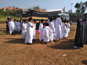 Sembilan September 2017, pagi cerah mentari menghangatkan bumi, angin bertiup sepoi-sepoi membuat dedaunan menyapa para mahluk di bumi. Tampak dari kejauhan lari lari kecil santri-santri SDI Al Umm menuju lapangan sekolah. Jubah hitam dan kerudung hitam membaluti tubuh mungil santi banaat , gamis dan baju ihrom putih menjadi kostum para santri baniin. Serasa lapangan dipenuhi warna hitam dan putih, gelak tawa , celotehan para santri turut meramaikan suasana manasik haji tahun ini.